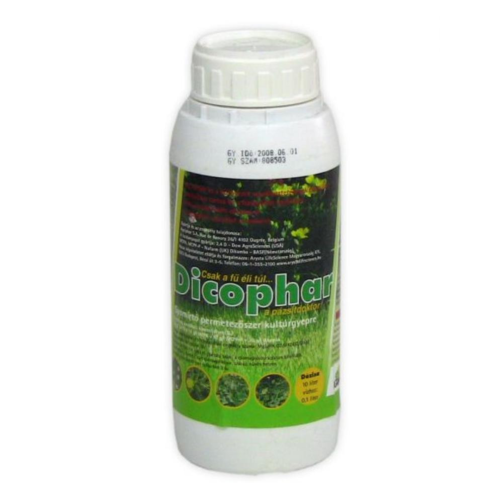 Dicophar gyep pázsot gyomirtó 500 ml. Elpusztítja az évelő és magról kelő kétszikű gyomokat. Legideálisabb gyomirtási időszak: május-június és augusztus-szeptember. 5-7 nappal a fűnyírás követően végezzük el a kezelést, amikor az éjszakai hőmérséklet 10 C felett van. Nyáron a permetezést reggel vagy este végezzük. Erős napsugárzásnál, vagy nagy melegben ne permetezzünk a megperzselődés veszélye miatt. A kezelést követő 24 órában eső csapadék a készítmény hatékonyságát csökkenti. Használati utasítás: 100 ml szert 10 liter vízzel keverve kell kipermetezni a gyepre egyenletesen, főleg a gyomokra irányítva. A kijuttatásra a háti permetezőt ajánljuk, mert így egyenletesebben oszlik el a permetszer, így jobb a hatékonysága. 500 ml szer 500 m2-re elegendő. A kezelést követően először egy hét múlva lehet újra füvet nyírni. Erősen gyomos területen a kezelést 4-6 hét múlva érdemes meg ismételni, hogy a magokról közben kikelt gyomok elpusztuljanak. A kopasz részeken 6 hét múlva lehet füvesíteni. Figyelem! Új füvesítés esetén legkorábban 6 hónap múlva lehet a kezelést elvégezni. A többi kétszikű növényt az esetleges permetfelhőtől óvni kell, mert fitotoxikus hatást okozhat, ezért szeles időben ne permetezzünk! Iskolák, óvodák pázsitjainak kezelését hétvégén, vagy szünet előtt végezzük. Forgalmi kategória: III. Gyártó: LAGON - FINAGRO Kft. Hatóanyag: 2,4-D 70 g/l, MCPA 70 g/l, MCPP-P 42 g/l, Dikamba 20 g/l.